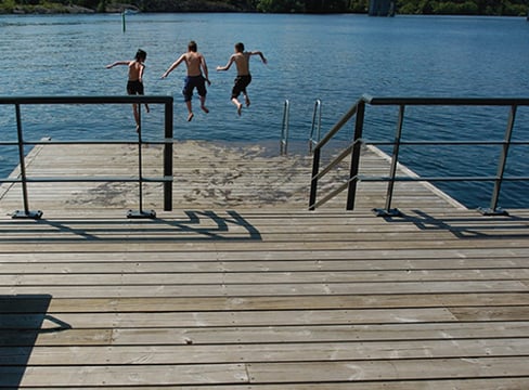 جسر للمشاه مصمم من خشب معالج بالتشريب وألواح الخشب الرقائقي (المصفح)في Hästepallarna، Uddevalla.