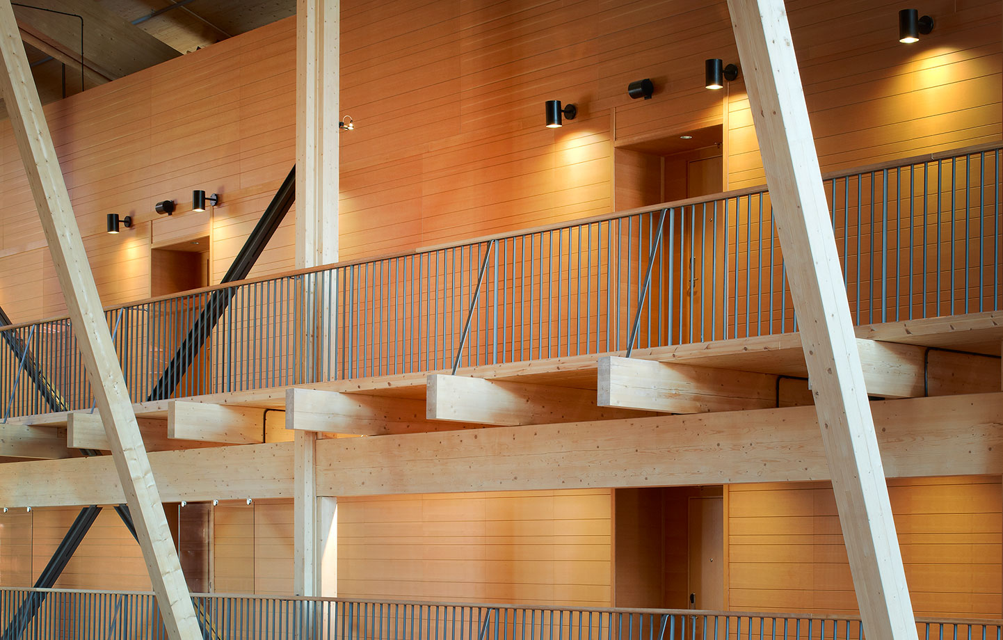 وتجدر الإشارة إلى أن الهياكل الخشبية المستخدمة في قواعد الأرضيات في المباني المرتفعة تستخدم وحدات صلبة أو متوسطة الصلابة. وفي وحدات الأرضيات الصلبة، فإن ألواح الخشب الحاملة للأوزان تكون مصنوعة من الخشب المصفح التقاطعي (CLT). ويمكن أن يُيتم إضافة قواعد أرضيات فوق هذا الإنشاء الأساسي بعد ذلك، ويتم وضع عناصر إنشائية للتسقيف في الجانب الداخلي، وهذا يكون اعتماداً على الغرض من الاستخدام. وبالنسبة للأجزاء الحاملة للأوزان، فإنه يتم لصق أو تثبيت الخشب الصلب ببعضه البعض.