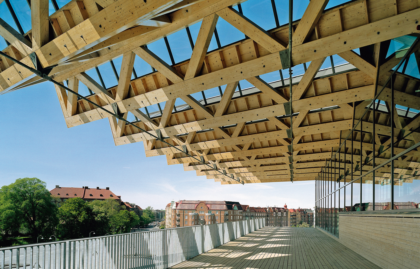 إن جناح المدخل في Universeum هو ربما أكثر المباني الخشبية في السويد إثارة. وهذا يُظهر، بشكل لا لبس فيه، أن الهياكل الكبيرة يمكن بناؤها في الخشب. إن استخدام المادة يمثل توحيد تام، مما يجسد الرغبة في استكشاف أقصى حدوده. فجملونات السقف الطويلة والمعلقة والواجهة الممزوجة بالزجاج\البلاستيك والخشب أصبحت علامة تميز التصميم الخارجي للمبنى، مع وجود عارضات طويلة في المدخل تميز تصميم المبنى الداخلي.