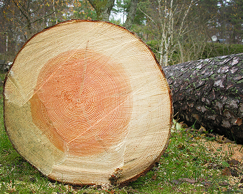 عندما تكون الشجرة جاهزة للحصاد يتم قطعها، فإنه عادة ما يتم قطع الفروع من الجذع وتقسيمه إلى جزء سفلي وجزء أوسط وجزء علوي، وواحد إلى ثلاثة أجزاء من الخشب اللبابي. ويمكن أن يتم جمع أخشاب قمم الأشجار وأخشاب الفروع لكي يتم قطعها واستخدامها بعد ذلك كوقود حطبي. وبالنسبة للأشجار الصغيرة التي يتم قطعها أثناء التقليم، فإنه يتم قطعها لتصبح خشب لبابي (خشب صالح لصناعة الورق) أو يتم قطعها بمقاييس صغيرة (على أن يكون الحد الأقصى لقطرها 120 - 200 مم). انظر الرسم التوضيحي أدناه.